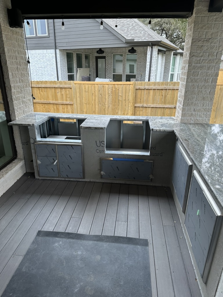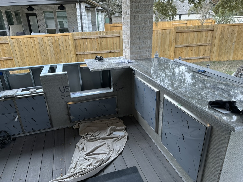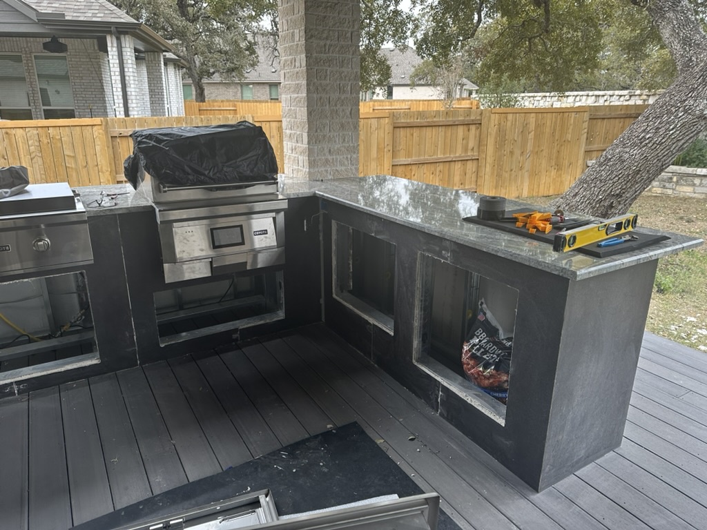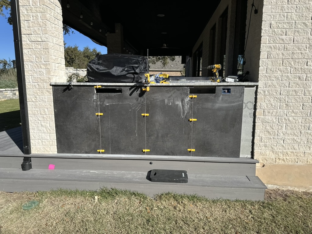 Slide in the griddle and pellet grill. Level so they sit flush with the countertop. Get a pro to connect power/gas, and add vent panels (low and high) for safety in closed bases.