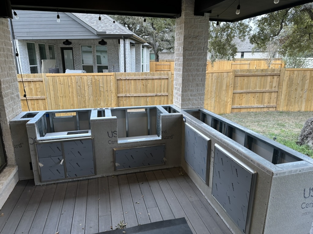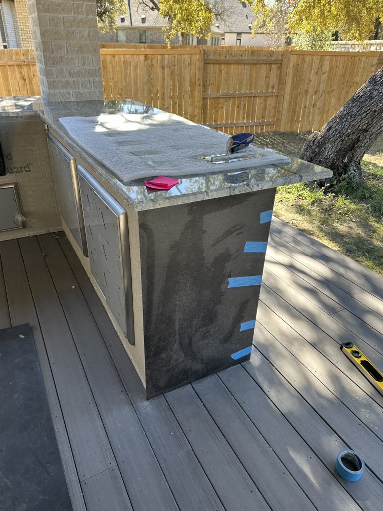 Choose a durable stone you love. The original build used a dramatic grey slab — great outside and easy to wipe down.