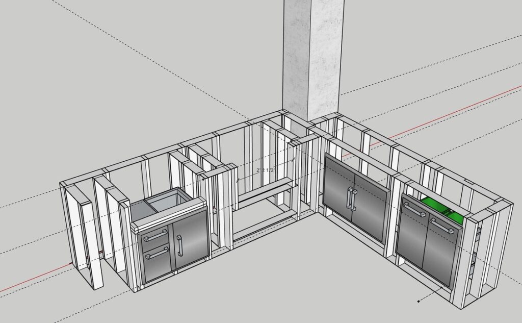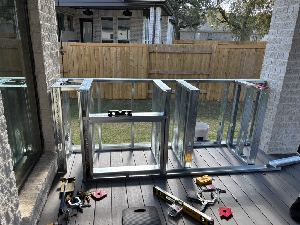 Lay the base track on your tape line, stand the studs, and screw them together. Frame simple rectangular openings for doors and appliances. Think “big TV cabinet, but metal.”