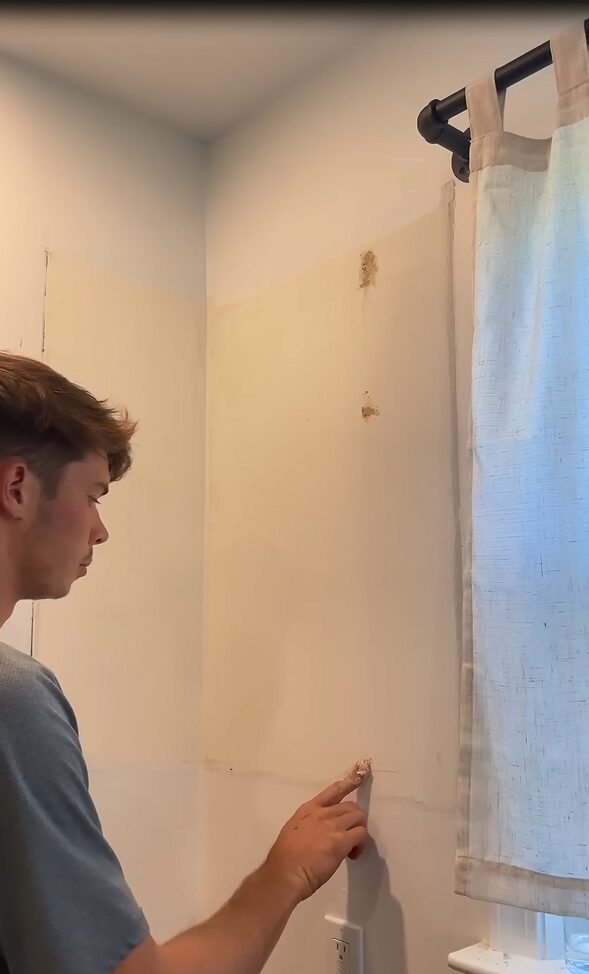 Start by unscrewing any old shelves, hooks, or items attached to the wall. Patch large holes using filler. Let it dry completely.