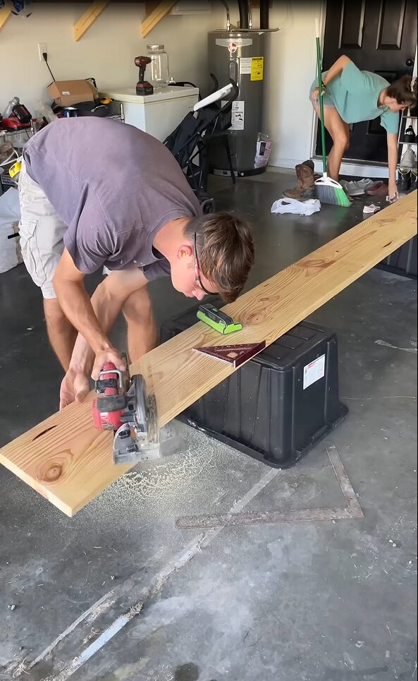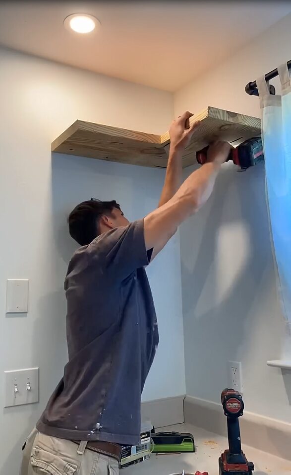Use a tape measure to size your wood shelves to fit the wall space. Cut them with a saw, then stain or paint them. Let dry.