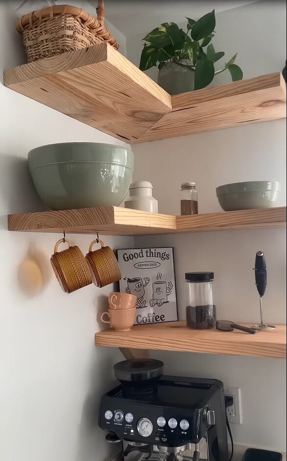 A beautiful, practical kitchen wall with floating shelves and hooks for daily use. The space feels fresh, warm, and intentional—perfect for any DIY home lover.